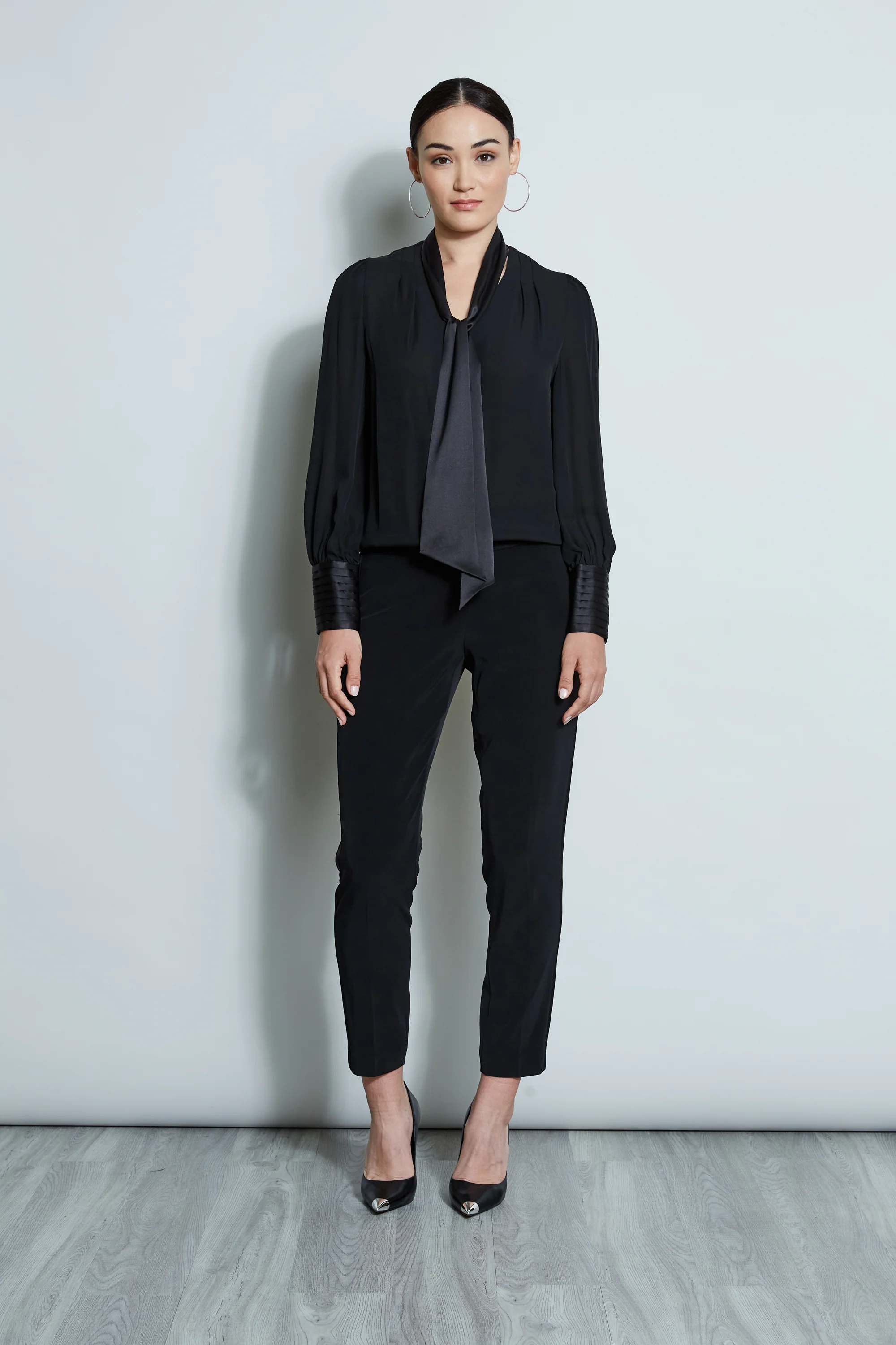 Elegantly feminine in Silk Georgette, our blouson shirt is accented with a removable Silk Satin Tie and dramatic pleated cuffs.