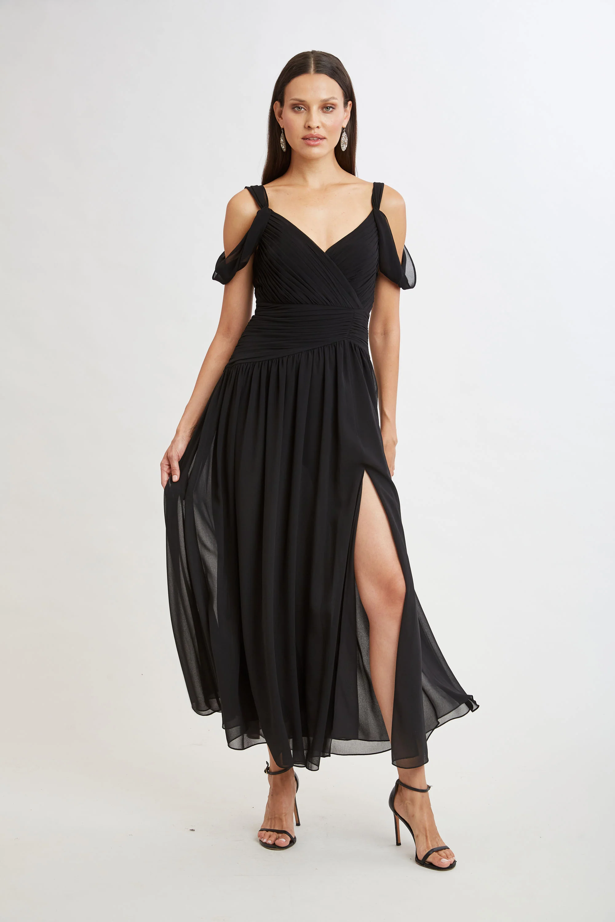 Step into elegance with our Georgette Gown. Designed with delicate pleat detailing on the bodice and waist and draped cold shoulder straps, and a fluid slitted skirt, this gown flows effortlessly with each step.