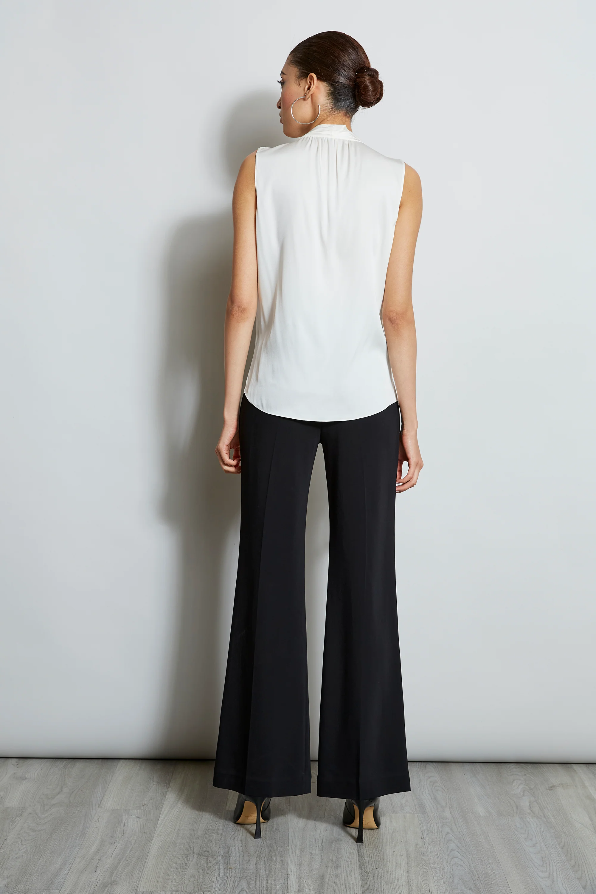 - Sleeveless, pleated shoulder top with stand collar and split neckline