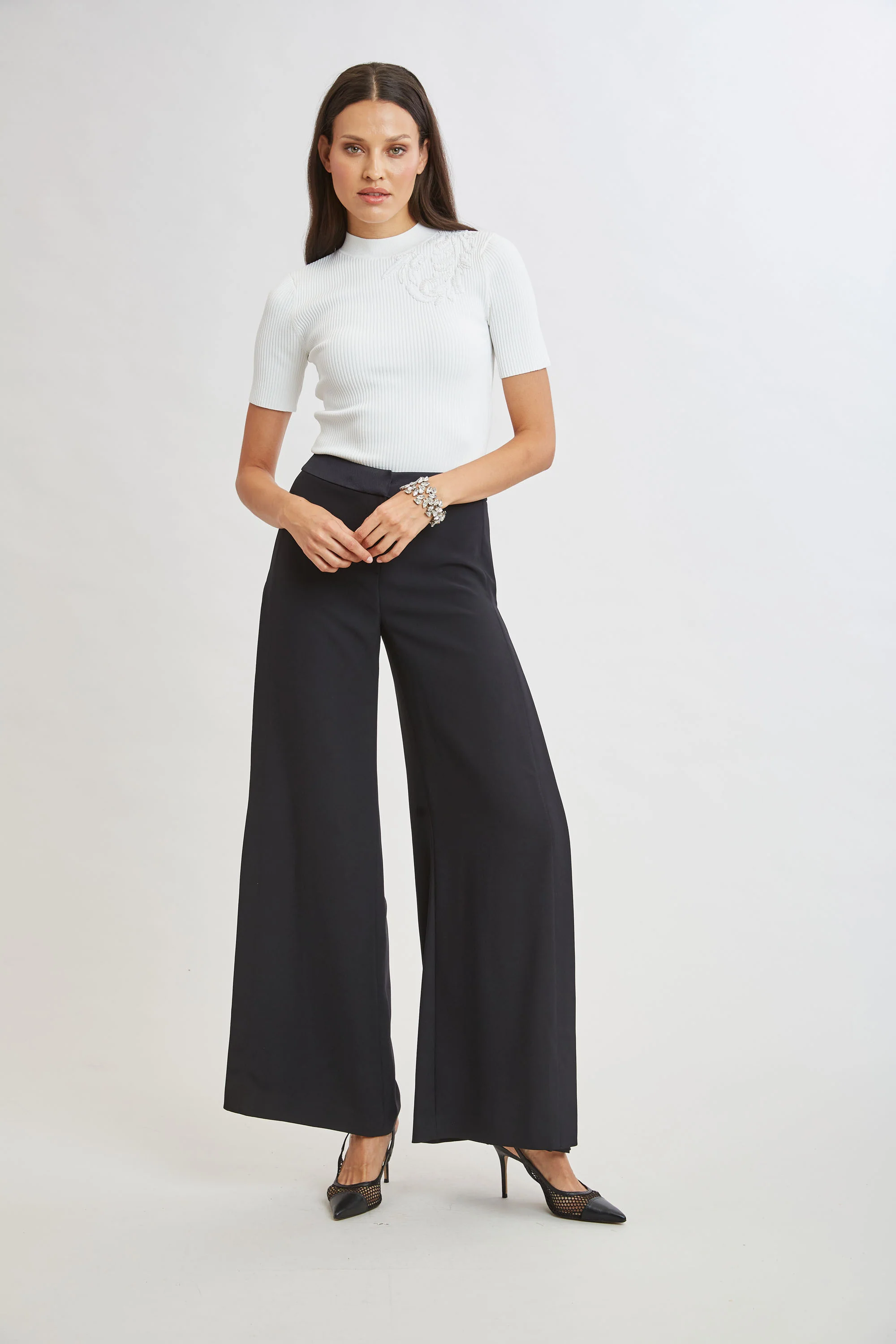 Elevate your wardrobe with Elie's modern take on the season's must have Ribbed Sweater. Sleek and body skimming, all eyes are on the intricate embroidery & beading. A true collector's piece.