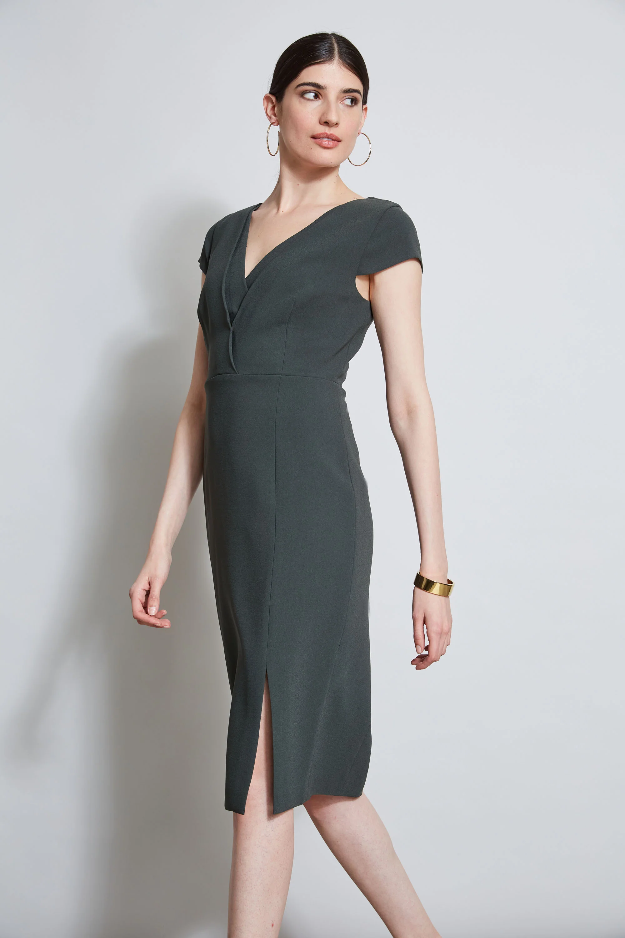 Elie's take on the season's must have sheath dress. The body contouring lines accent its modern slit & double layer v-neckline. Designed in our signature Fluid Crepe, it flatters every curve. This dress is destined to become a favorite for desk to dinner.